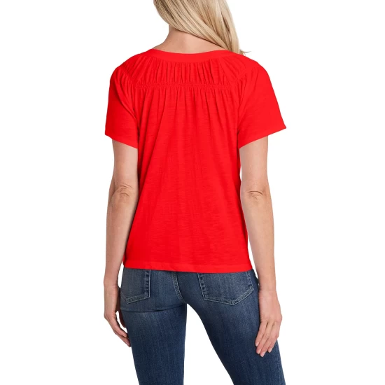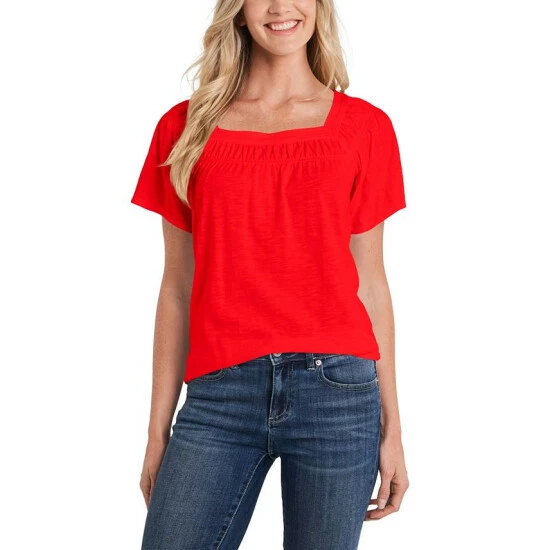 Graceful gathers soften a chic square neckline on this soft knit T-shirt from CeCe.