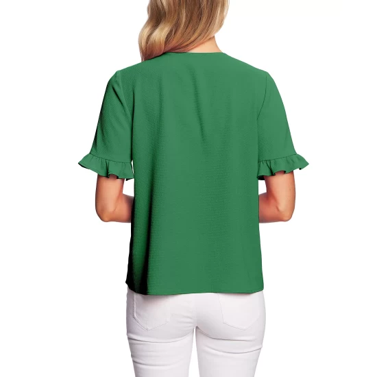 The classic notched collar styling of this CeCe jacket gets a feminine update with micro-pleated ruffles peeking from beneath fold-back cuffs trimmed with imitation pearl buttons.