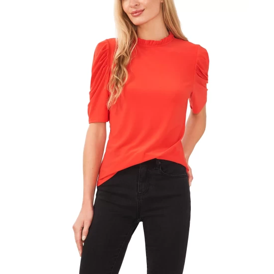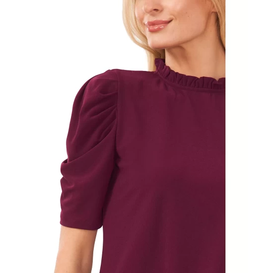 Gathered puffed sleeves lift elegantly toward the shoulder of this refined top by CeCe. Its ruffled neckline leaves no doubt of its super-chic style.