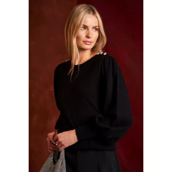 A glam update to your sweater collection, this CeCe style stuns with glittery shoulders and sweet puffed sleeves.