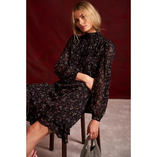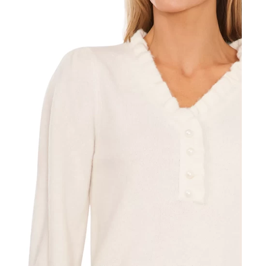- Smocked neckline; ruffled hem; buttoned cuffs